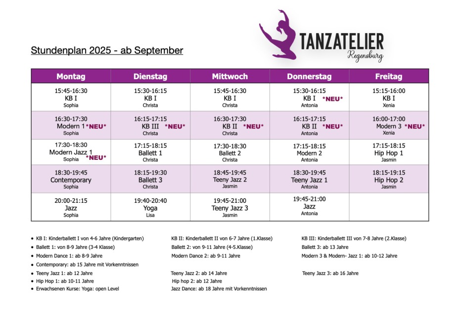 Stundenplan ab 15.09.2025 imTanzatelier-Regensburg